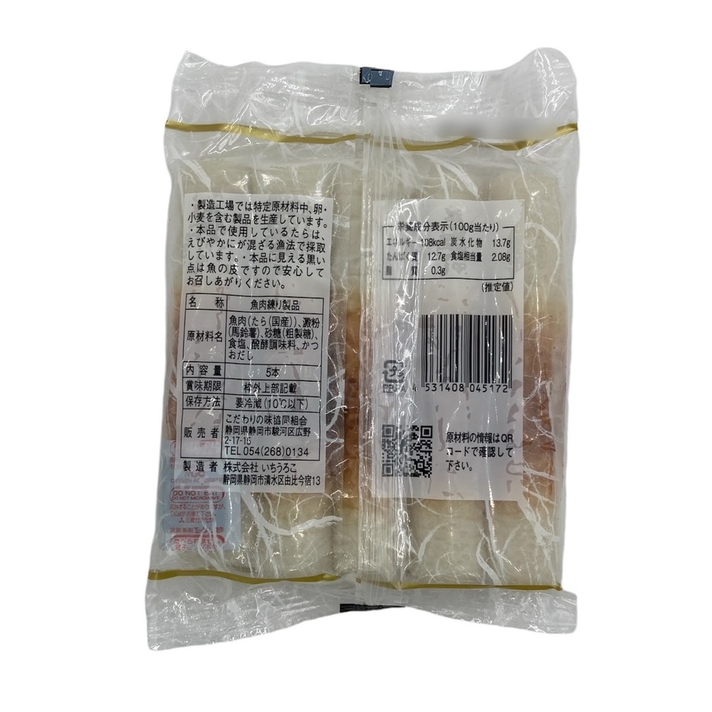 原材料:魚肉(たら(国産))、澱粉(馬鈴薯)、砂糖(粗製糖)、食塩、発酵調味料、かつおだし