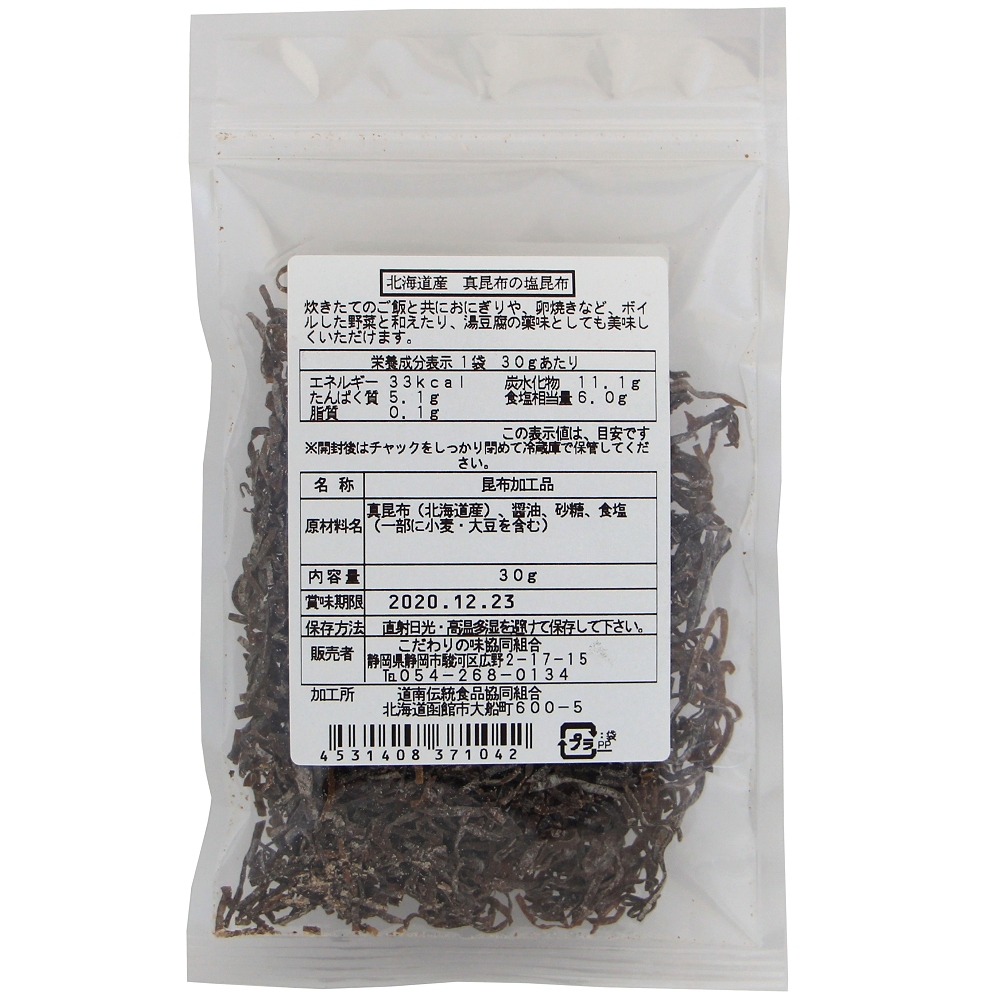 北海道産の真昆布100%!化学調味料・保存料不使用で、醤油、てんさい糖、塩のみのシンプルな味付けです。 おにぎりはもちろん、玉子焼きや、ボイルした野菜と和えたり湯豆腐の薬味にしたりと、様々なお料理にお使い頂けます。 商品コード:637104 JANコード:4531408371042 内容量:30g 原材料:真昆布(北海道産)、醤油、砂糖、食塩 賞味期限:365日 保存方法:常温 製造メーカー:道南伝統食品協同組合(北海道函館市)