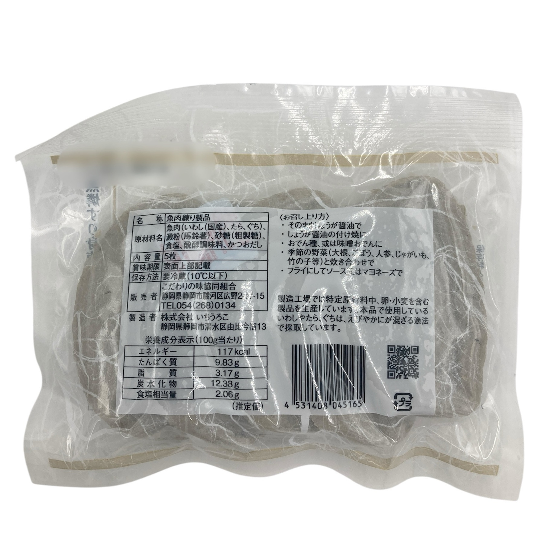 原材料:魚肉(いわし(国産)、たら、ぐち)、澱粉(馬鈴薯)、砂糖(粗製糖)、食塩、発酵調味料、かつおだし